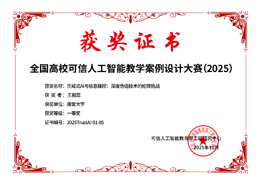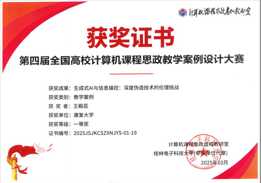 近日,第四屆全國高校計算機課程思政教學案例設計大賽獲獎名單正式公布。康復大學公共教學部王殿蕊老師參賽作品《生成式AI與信息操控:深度偽造技術的倫理挑戰》榮獲大賽一等獎,同時斬獲"可信人工智能"賽道一等獎。